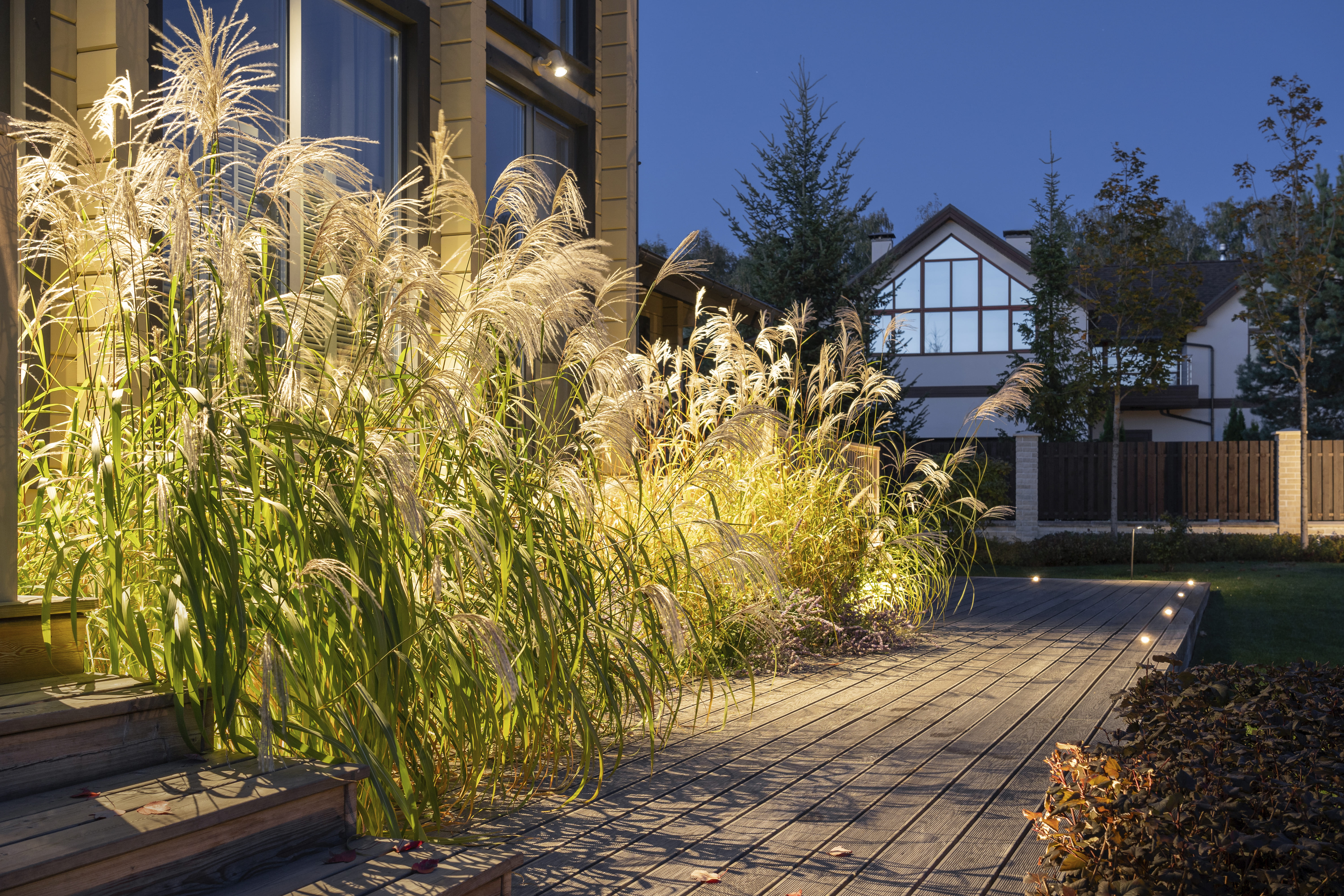 В непосредственной близости от дома располагается живописный уголок, где произрастает мискантус — декоративная трава, которая образует живую изгородь и придает пространству особое очарование. Первое, что бросается в глаза, – сад для отдыха: никаких грядок и энергоемких миксбордеров. Злаки, стриженые кустарники и лесной пейзаж. Выбор растений был основан на агротехнических требованиях: для солнечных зон подбирались одни виды, для теневых – другие. Это обеспечило оптимальное развитие и привлекательный вид даже при минимальном уходе. В композиции использованы неприхотливые растения, а декоративности здесь добились за счет форм, цвета листвы и веток.