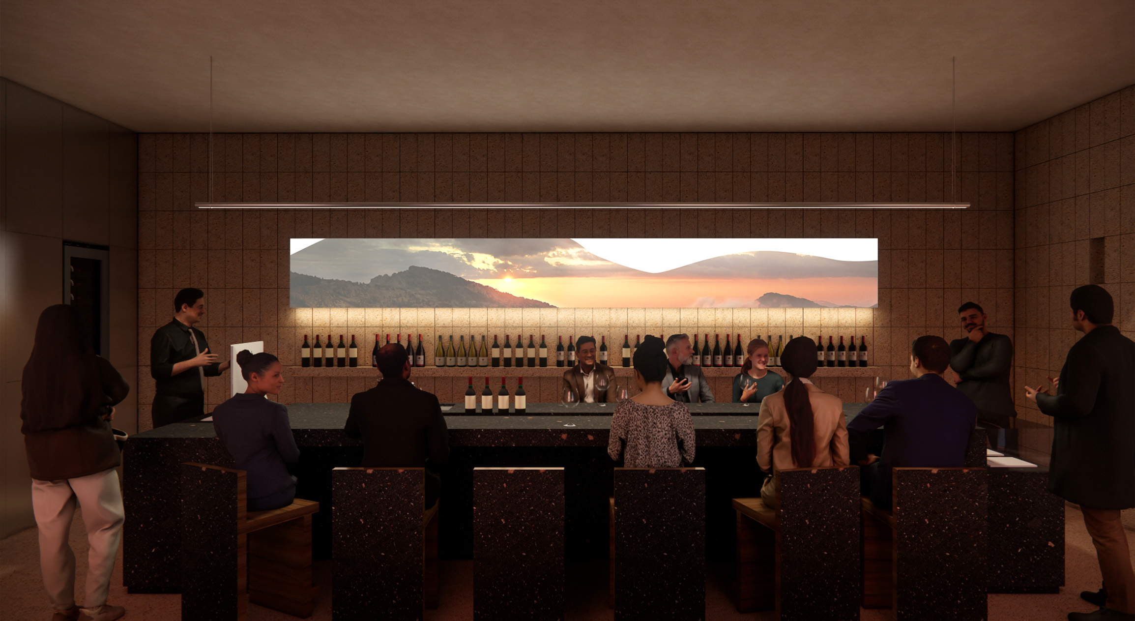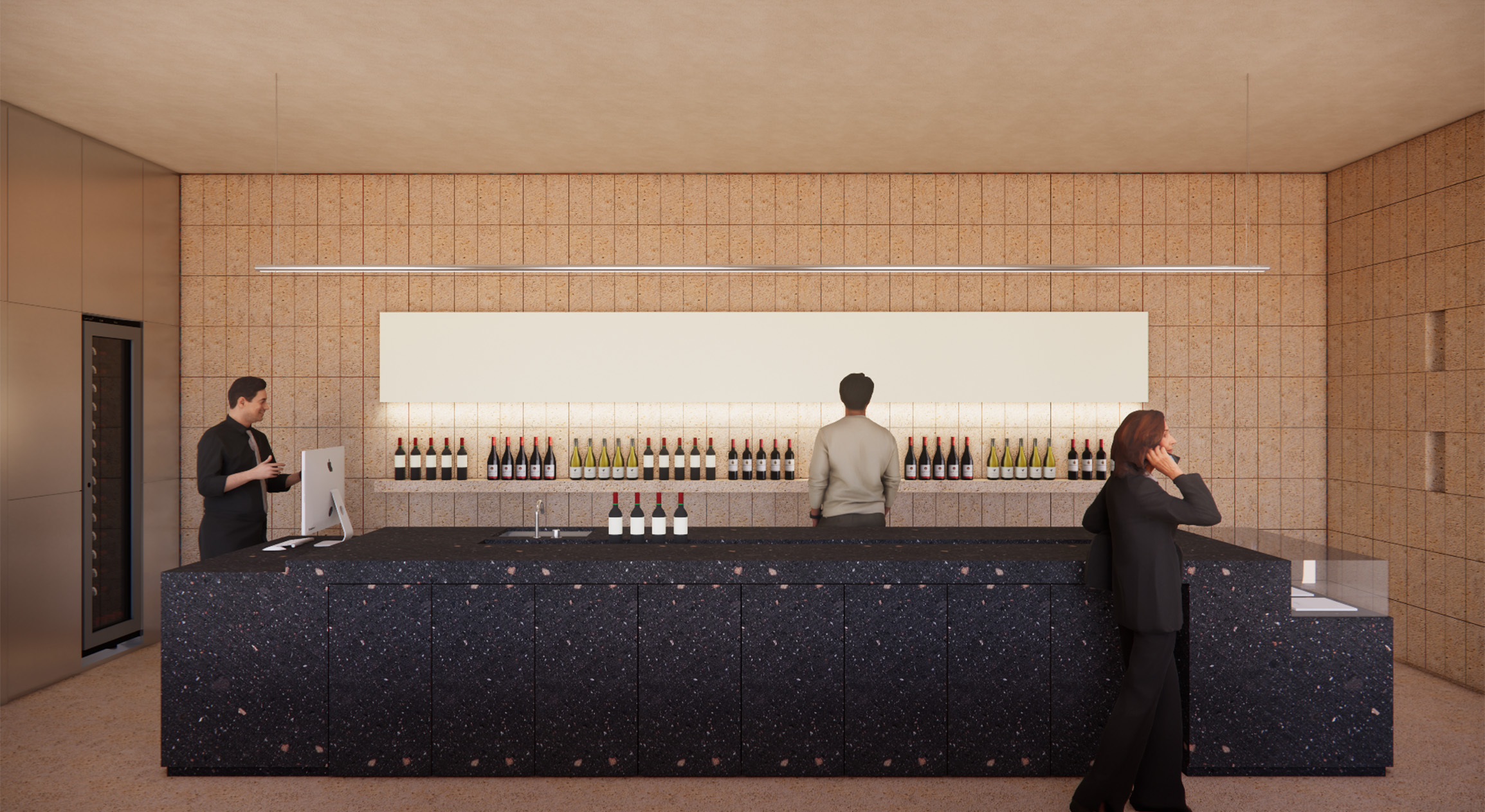 Винный бутик задуман как живое пространство, которое подстраивается под разные сценарии — от повседневной работы магазина до дегустаций и презентаций. В интерьере встречаются натуральные текстуры камня, а элементы из нержавеющей стали отсылают к производственному процессу, подчеркивая современный, индустриальный характер пространства.