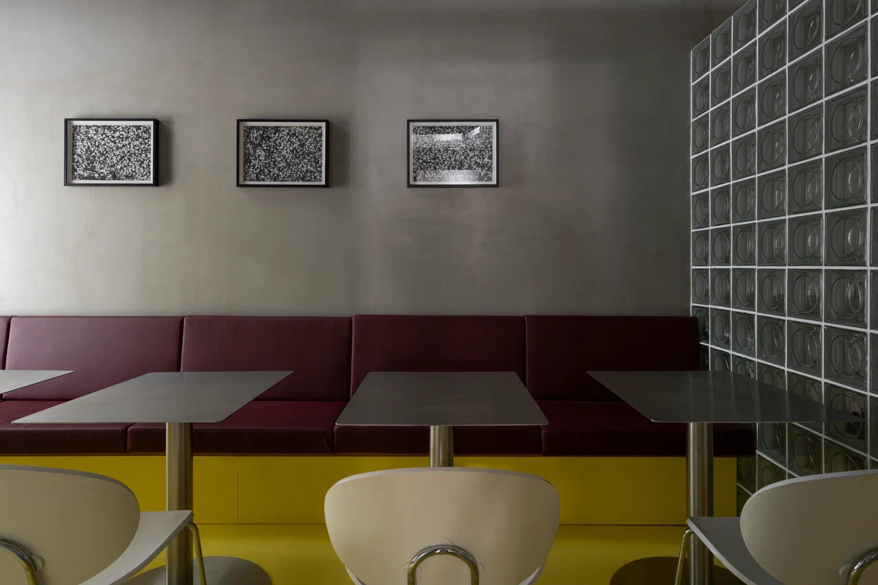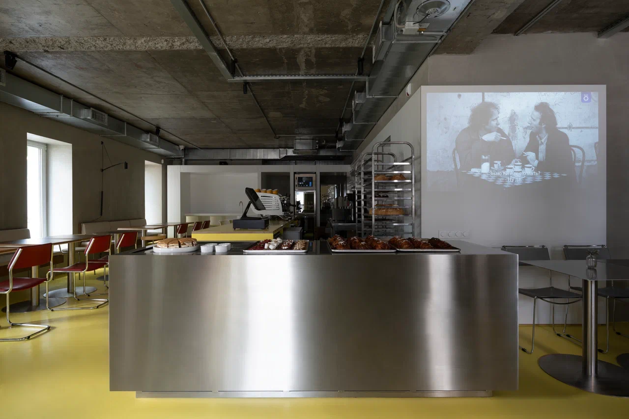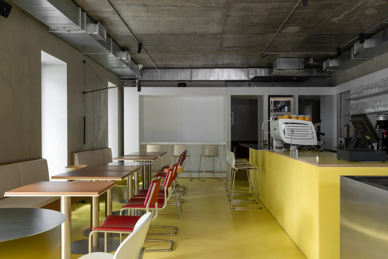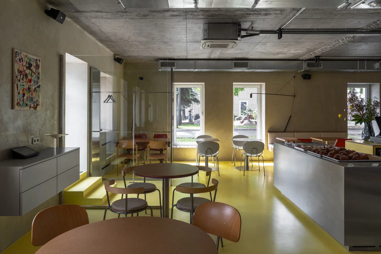Пространство организовано рационально: малый и большой зал с барной стойкой, кухня с собственной пекарней, складские и санитарные зоны. Акцент большого зала — бар, состоящий из двух контрастных блоков: один из нержавеющей стали с витриной для выпечки и напитков, другой из дерева — рабочая зона бариста и официантов. При этом за ней можно и поработать, и посидеть с чашкой кофе. Пространство объединяет желтый пол — элемент, ставший эмоциональной точкой входа в кафе.