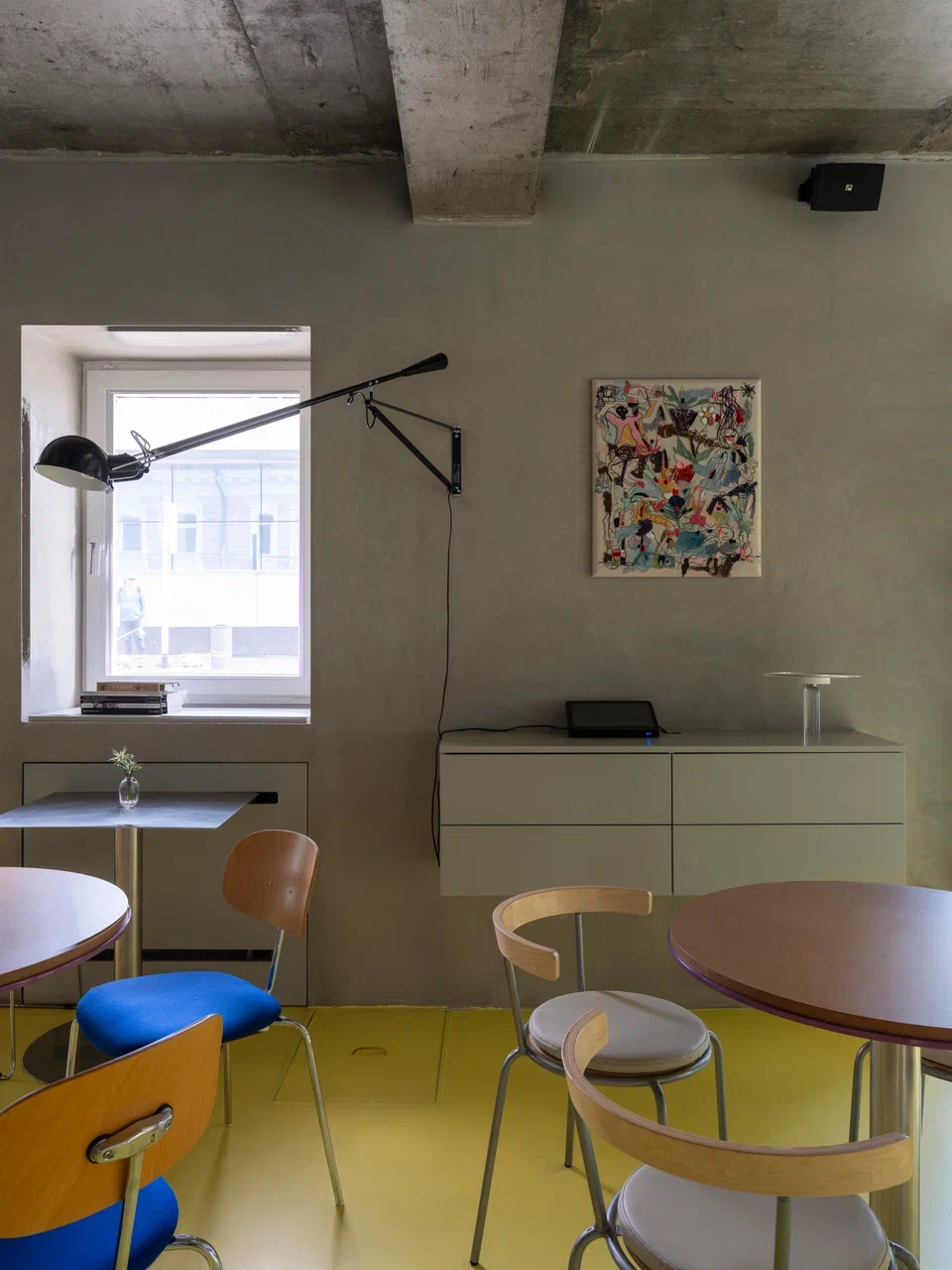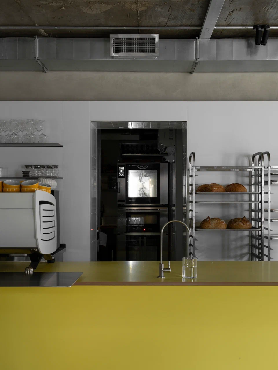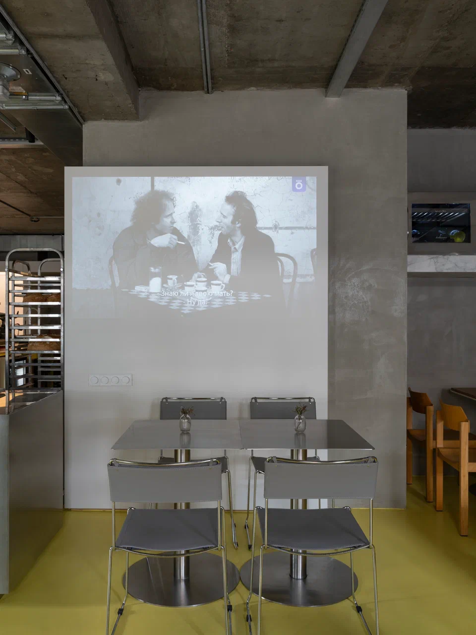 Пространство организовано рационально: малый и большой зал с барной стойкой, кухня с собственной пекарней, складские и санитарные зоны. Акцент большого зала — бар, состоящий из двух контрастных блоков: один из нержавеющей стали с витриной для выпечки и напитков, другой из дерева — рабочая зона бариста и официантов. При этом за ней можно и поработать, и посидеть с чашкой кофе. Пространство объединяет желтый пол — элемент, ставший эмоциональной точкой входа в кафе.