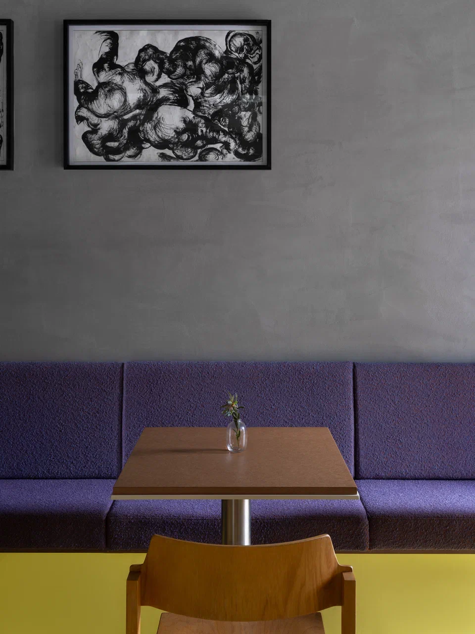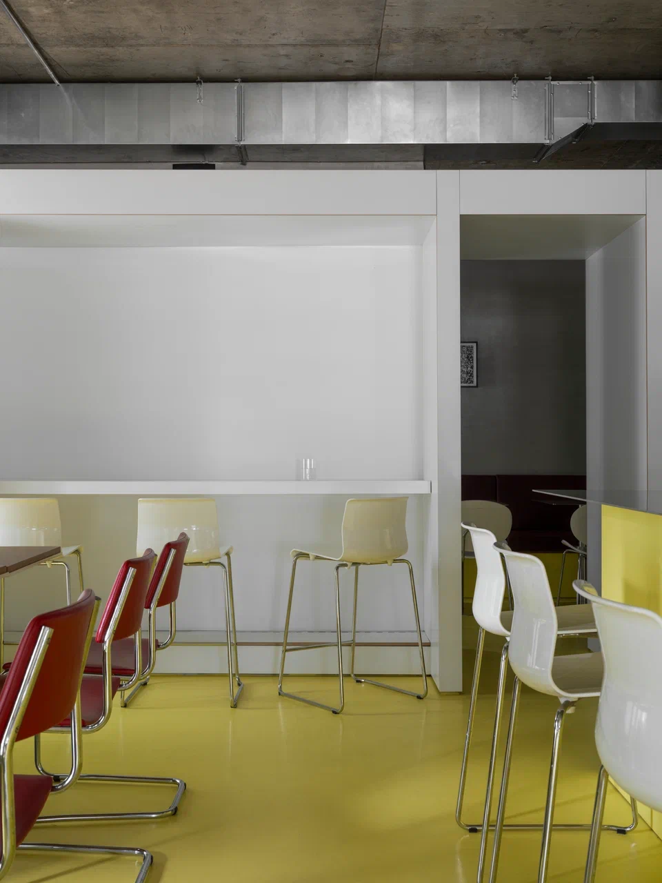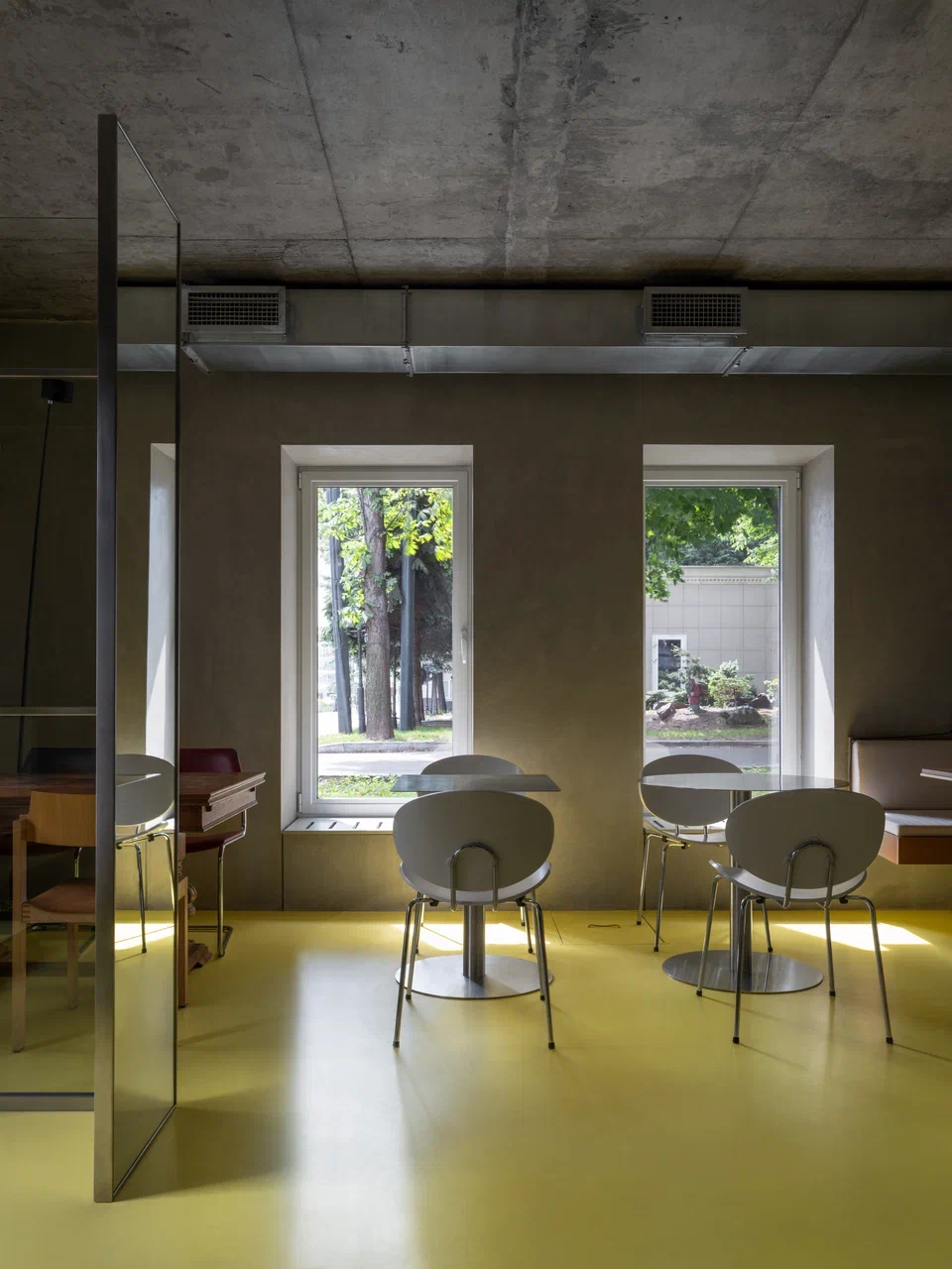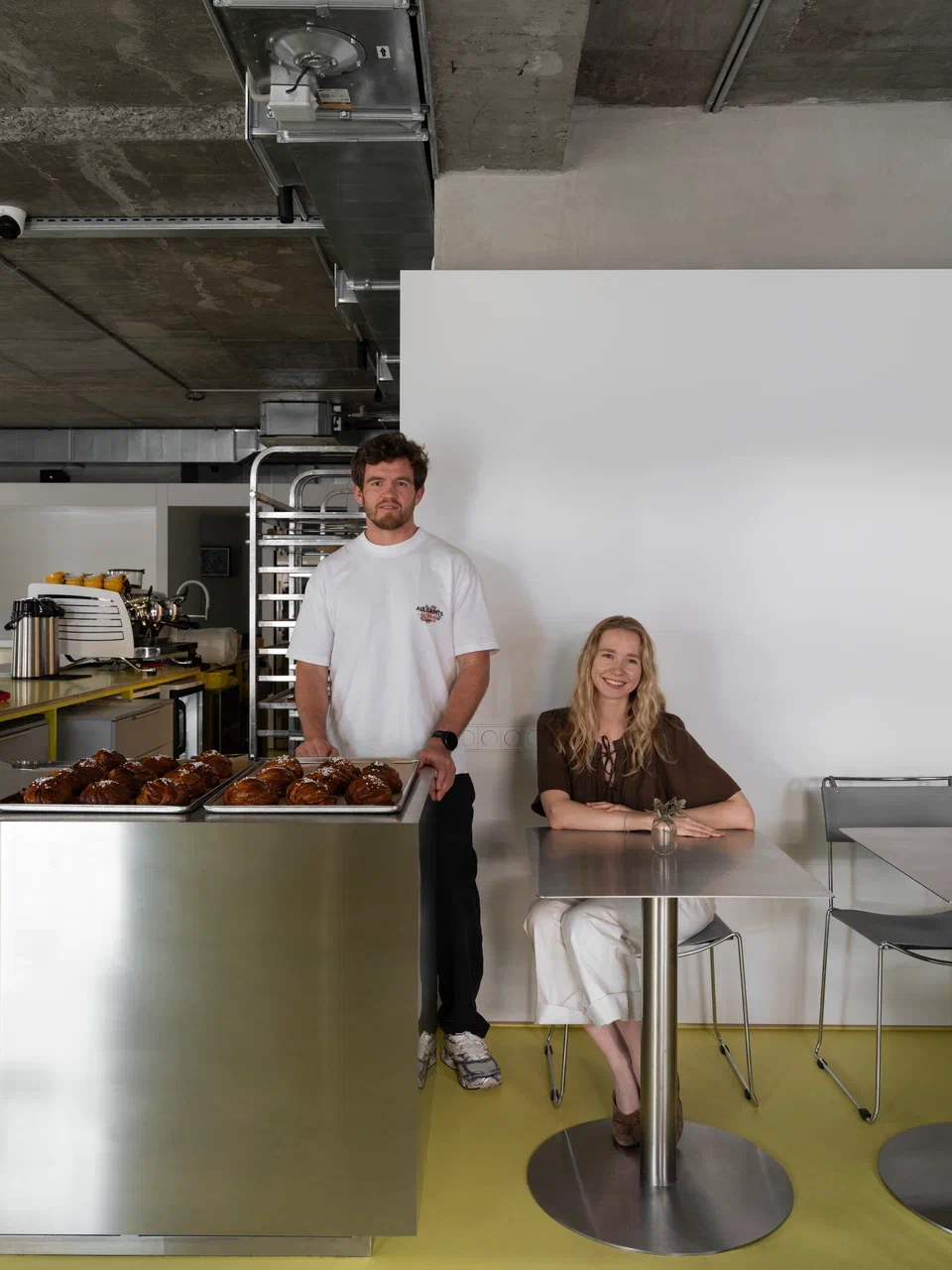 Пространство организовано рационально: малый и большой зал с барной стойкой, кухня с собственной пекарней, складские и санитарные зоны. Акцент большого зала — бар, состоящий из двух контрастных блоков: один из нержавеющей стали с витриной для выпечки и напитков, другой из дерева — рабочая зона бариста и официантов. При этом за ней можно и поработать, и посидеть с чашкой кофе. Пространство объединяет желтый пол — элемент, ставший эмоциональной точкой входа в кафе.