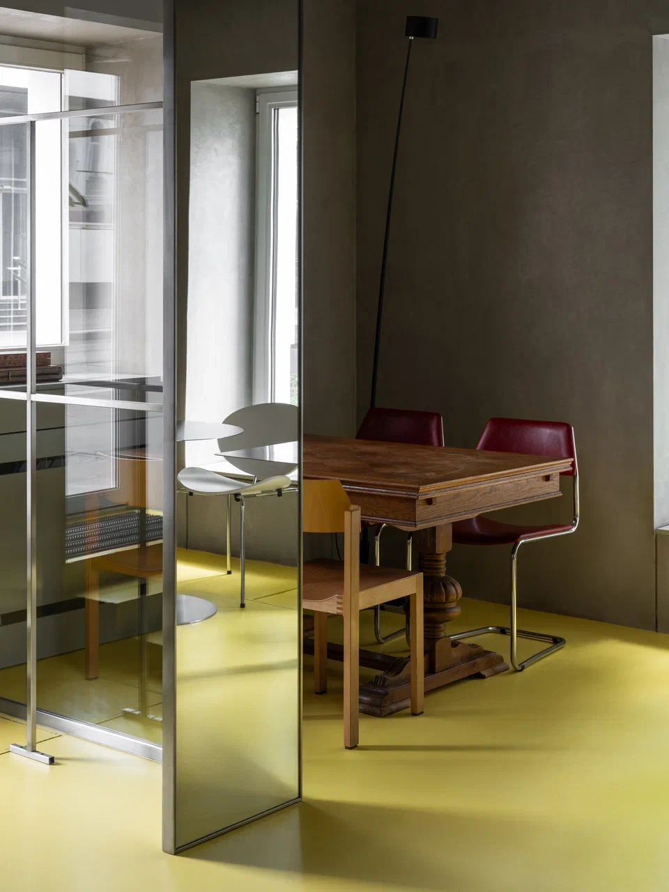 Желтый пол стал важной акцентной деталью: он соединил пространства, объединил элементы интерьера и придал ему ритм. Как отмечают архитекторы, идея яркого пола возникла еще в момент работы над интерьером квартиры Владислава (основателя MAST и «Культурного кода» — прим. Редакции), но была реализована лишь в этом проекте.