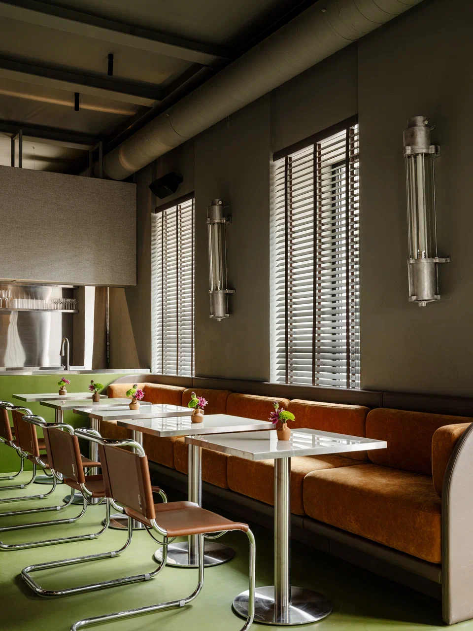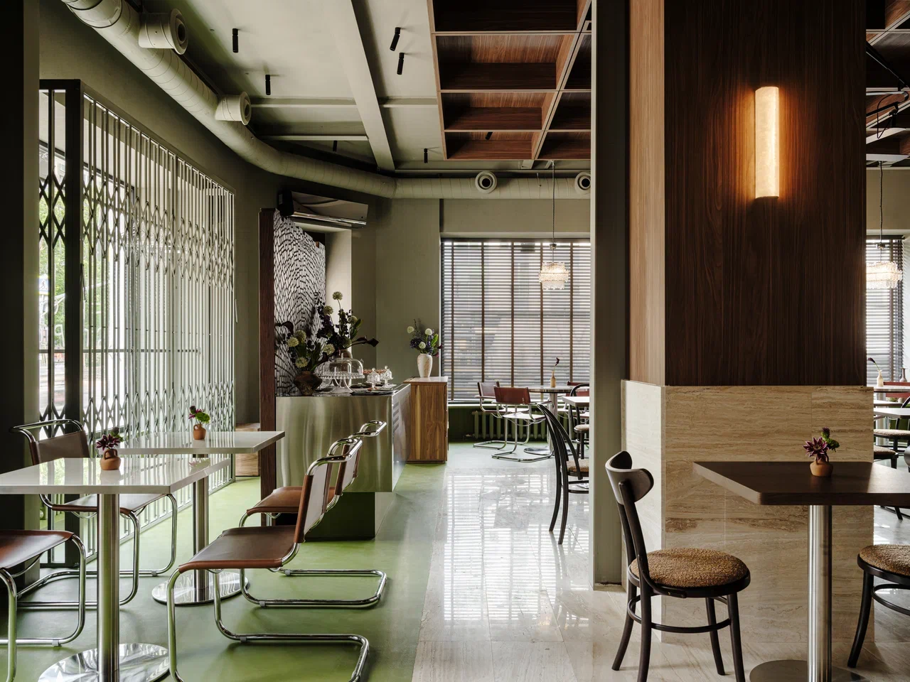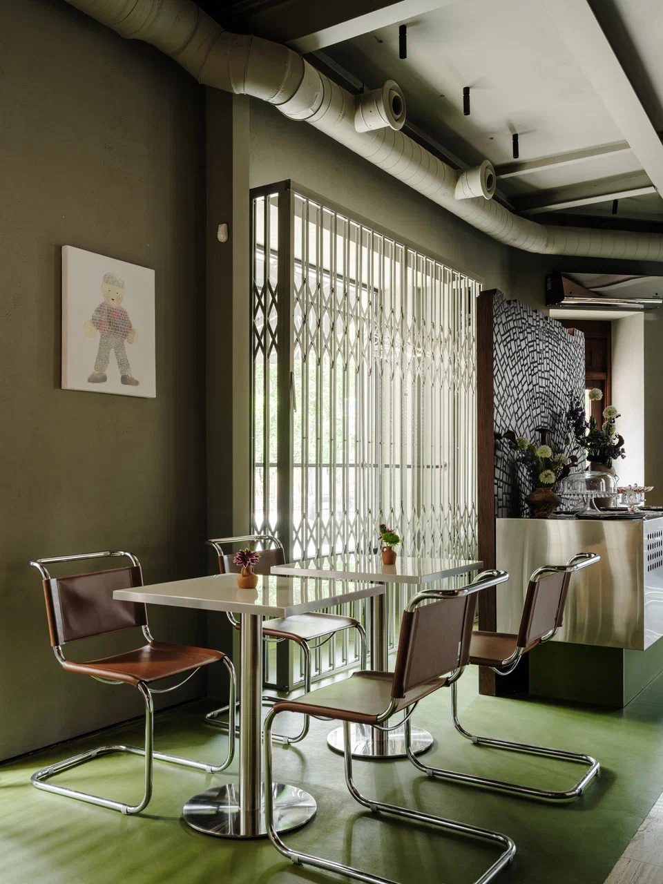 Архитекторы признаются, что для них Тбилиси — это и влияние европейских столиц — Парижа и Берлина. В центре зала расставлены классические деревянные стулья и столы со скатертями — оммаж Франции. Вдоль окон расположены стулья из нержавеющей стали и старые немецкие индустриальные светильники, привезенные из Германии, как отсылка к улицам Берлина.