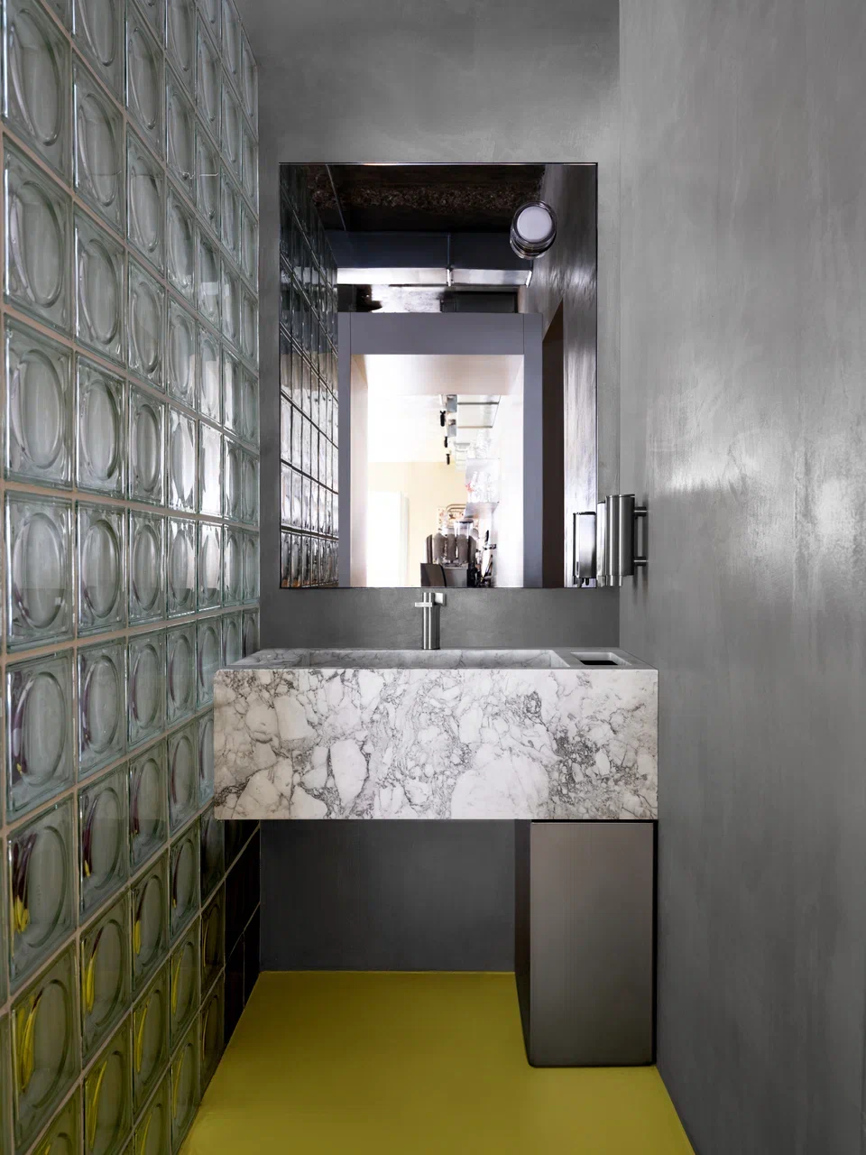 Решение санузлов, расположенных в подвале, — андеграунд. Гость словно спускается в ночной клуб, на рейв — портал туда, где город не спит.