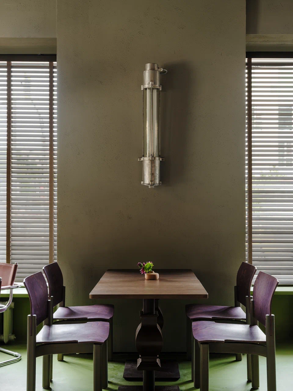 Интерьер сложен из подлинных вещей без стилизаций и реплик. Почти вся мебель — винтаж из европейских антикварных магазинов: стулья, массивный деревянный стол начала XX века. Остальные столы и столешницы выполнены по авторским чертежам команды. На стенах — картины Ромы Пикса и Натальи Чубаровой, художников, с которыми команда давно сотрудничает.
