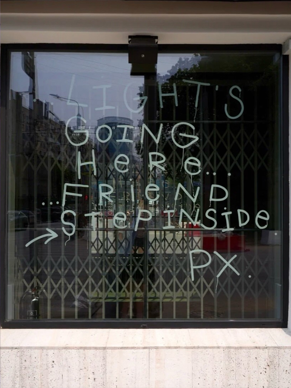А на стекле — фраза, обращенная к каждому с улицы: lights going here / friends / step inside.