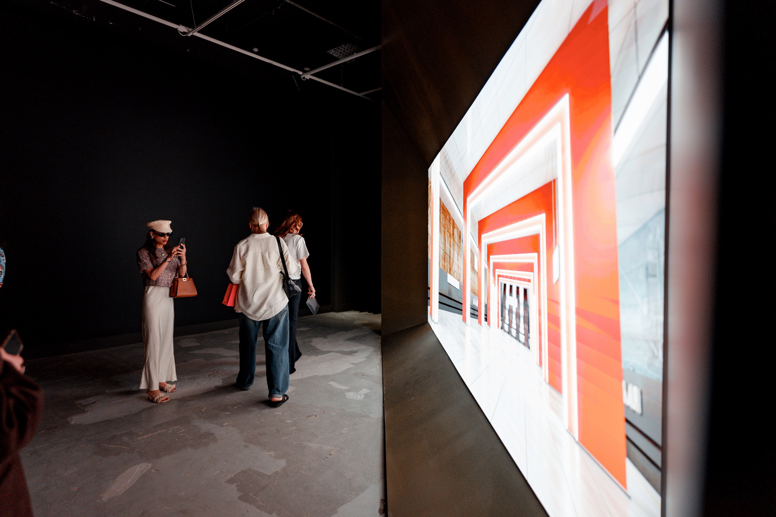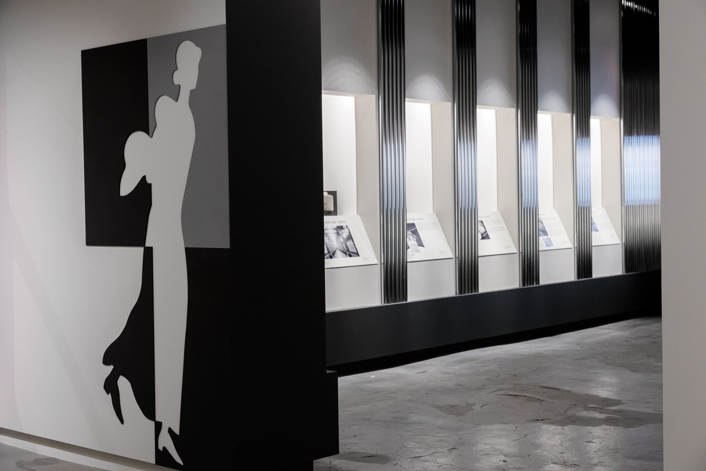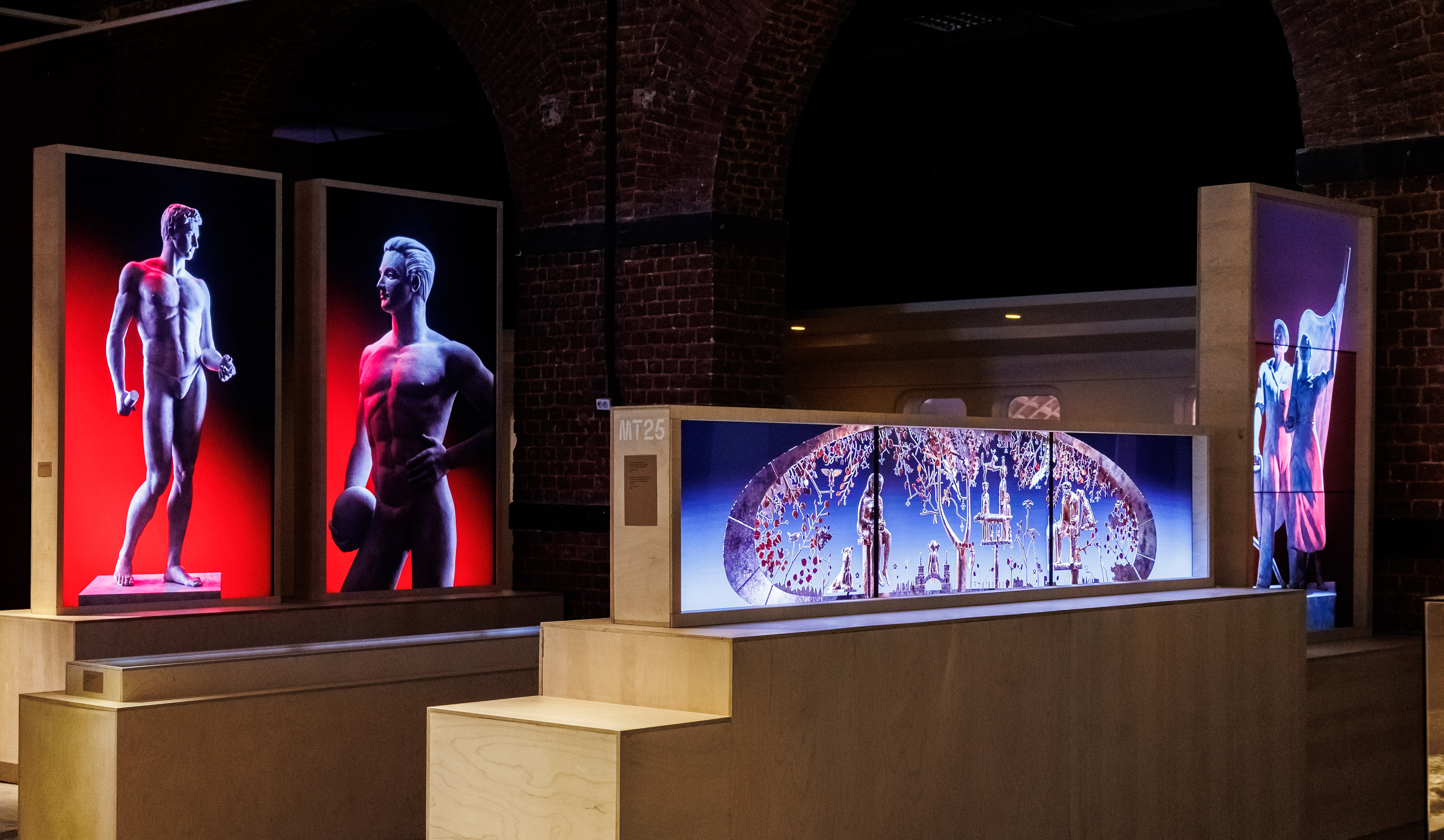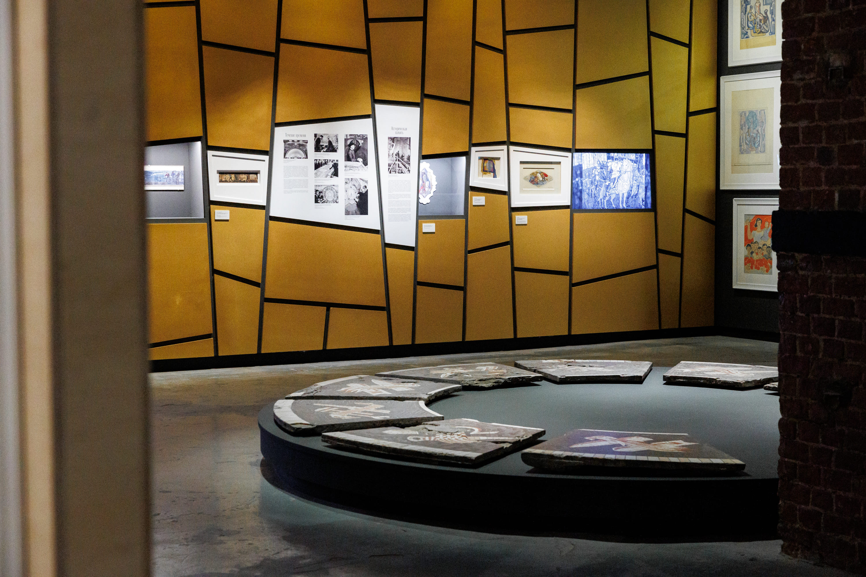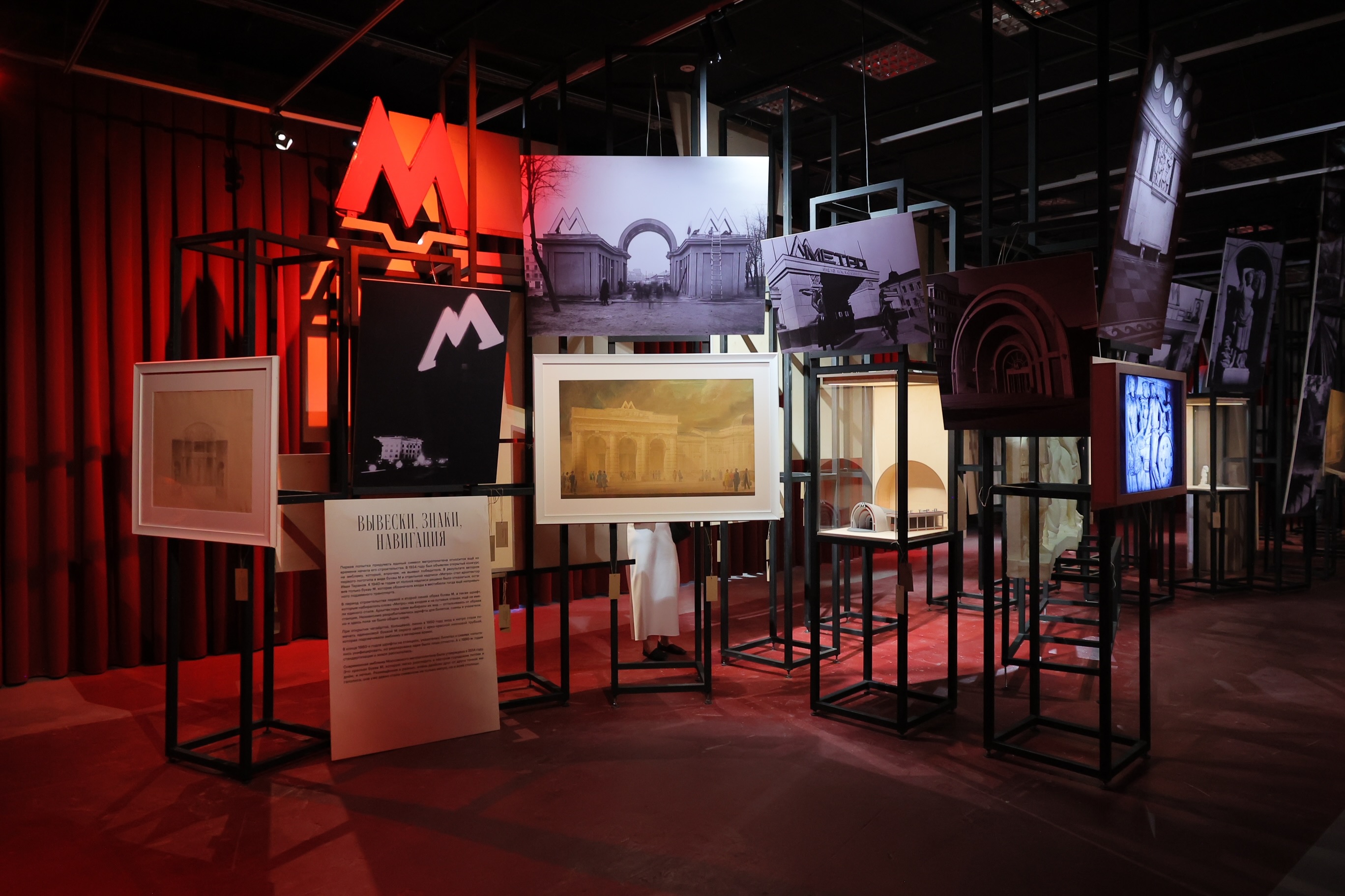 Центральному залу, посвященному «Забытому», обрамленному драматичной, немного театральной бордовой драпировкой, напоминающей занавесы на сценах домов культуры, вторит разговор о будущим, где все жесткое, отражающиеся, огромные экраны переносят нас в те станции метро, которые будут введены в эксплуатацию скоро. Поэтому в качестве основной идеи архитектуры нами был выбран диалог между настоящим реальным и метафизическим через разные приемы», — Агния Стерлигова, архитектор проекта, архитектурное бюро Planet 9.