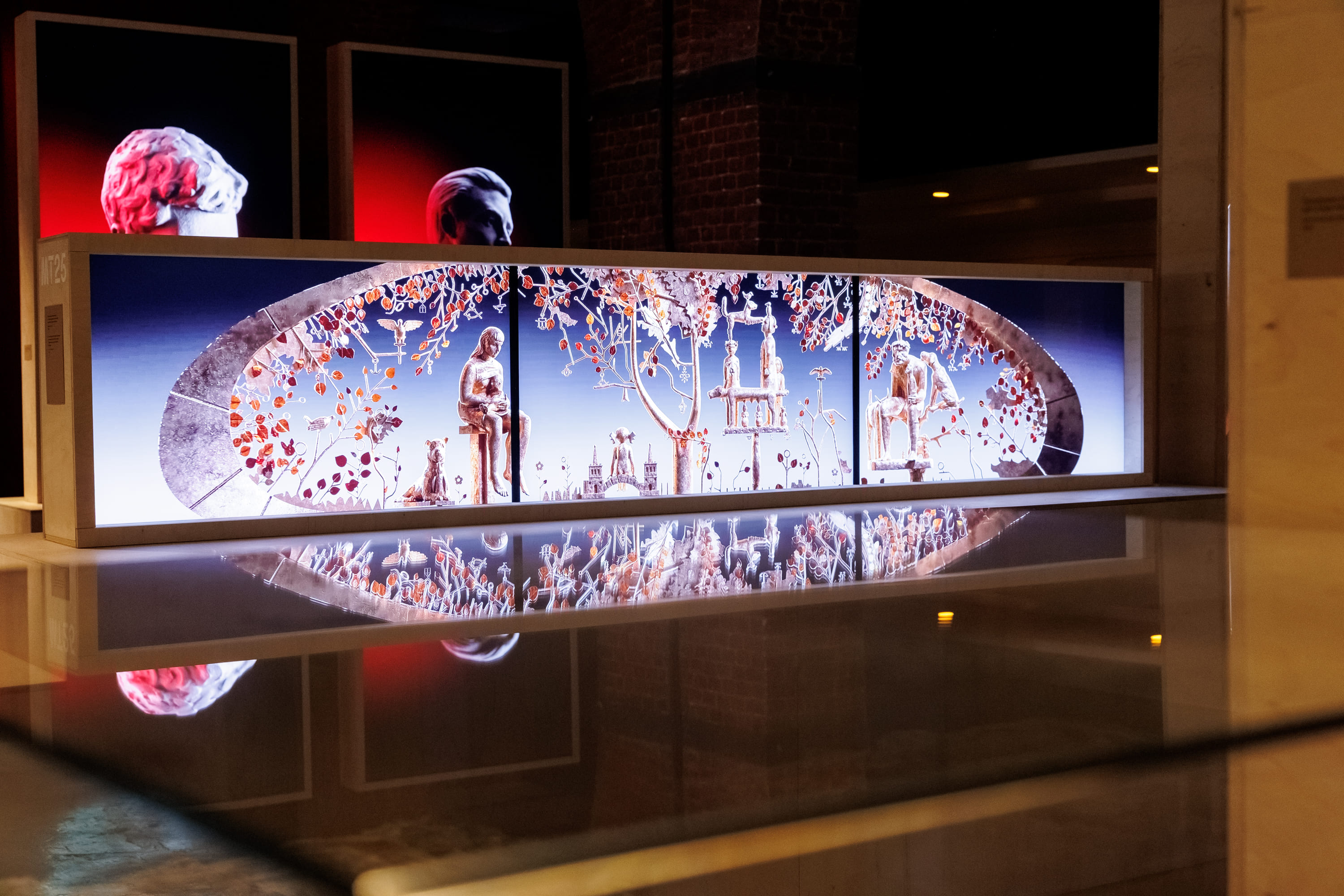 Например, так выстроена мизансцена с видеоэкранами, на которых изображена видеоинсталляция со скульптурами. Тут же мы делаем зеркальный потолок, который настраивает нас на восприятие того, что мы видим в реальности, и на отражение этого в другом зеркальном регистре. Воспроизведенной копии вагона метро, в котором каждый из нас так или иначе бывал, вторит такая другая часть, более абстрактная, через которую мы выходим с выставки.