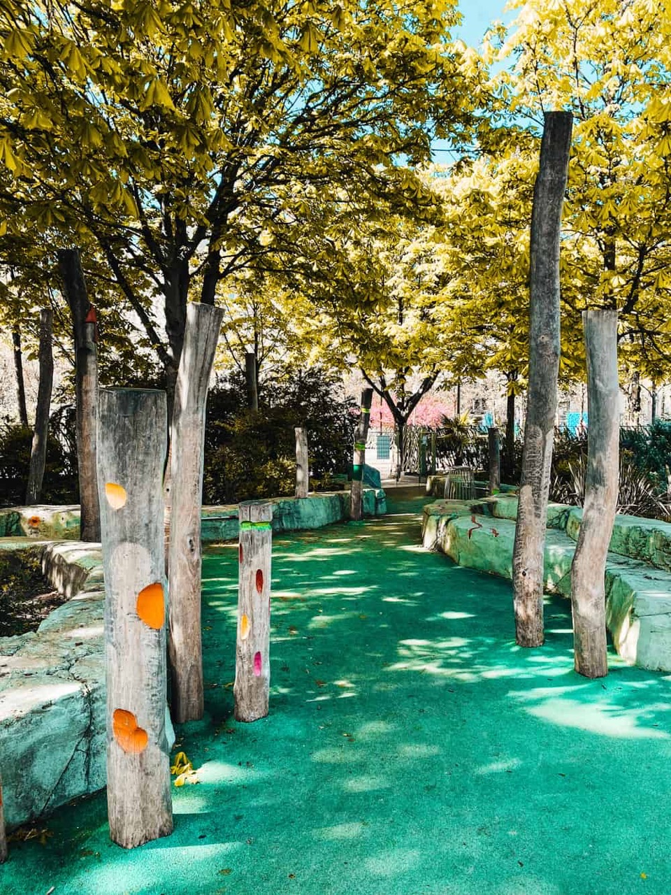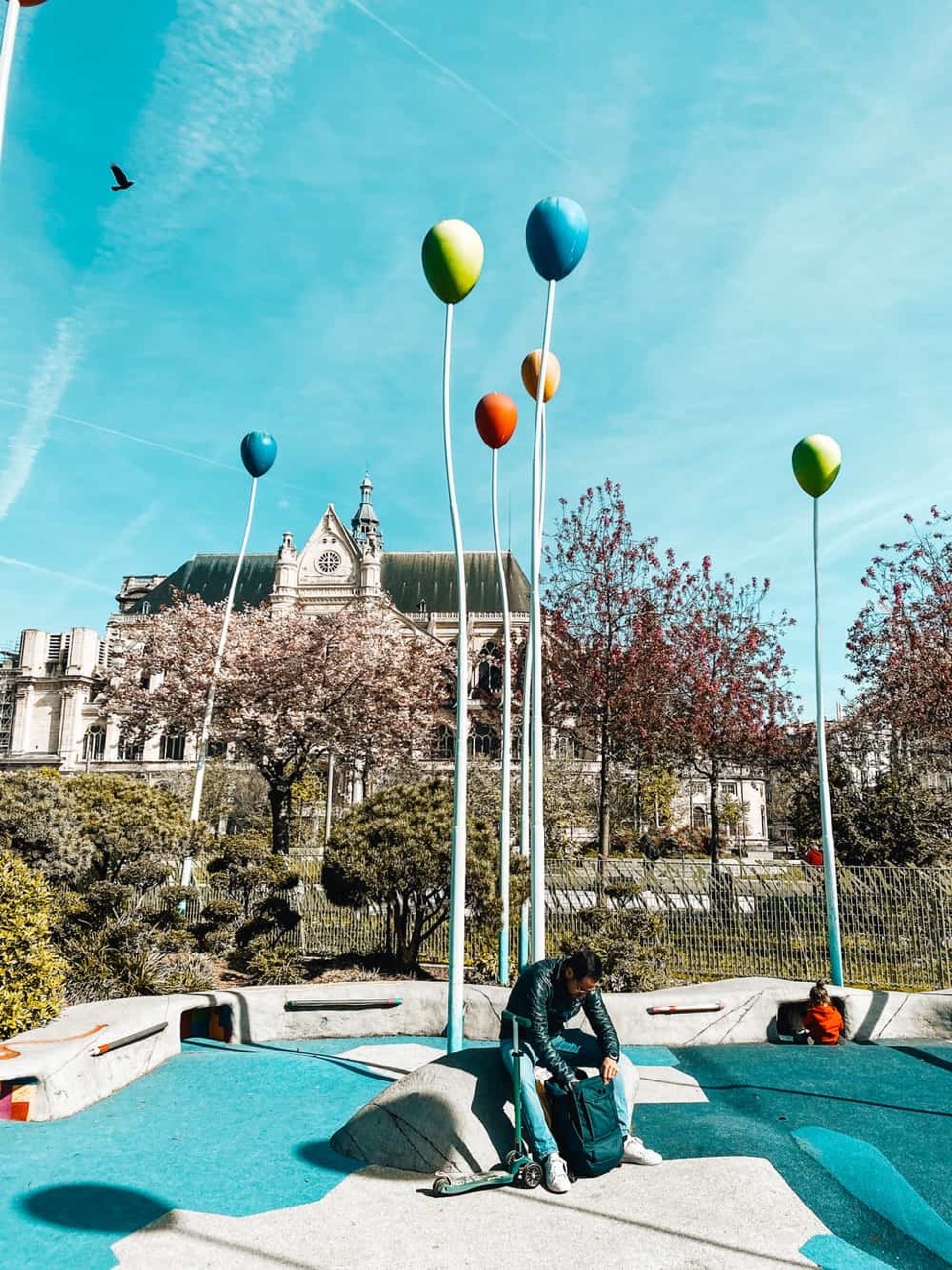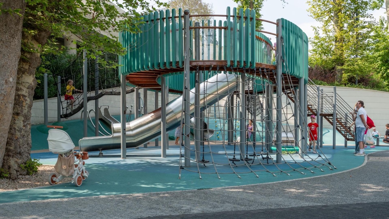 Этот парк — пример того, что даже если нет детской зоны, то живописный маршрут, водоем и обитающие в нем животные могут скрасить прогулку с детьми. Особенная радость — водные элементы: распылители пара, колонки и питьевые фонтанчики, система ручейков и небольших прудов. В Париже детская площадка умеет «дышать». Ее дыхание — водяной пар распылителей, которые встречаются повсюду. Прохлада становится игровым элементом, осязаемым и волшебным.
