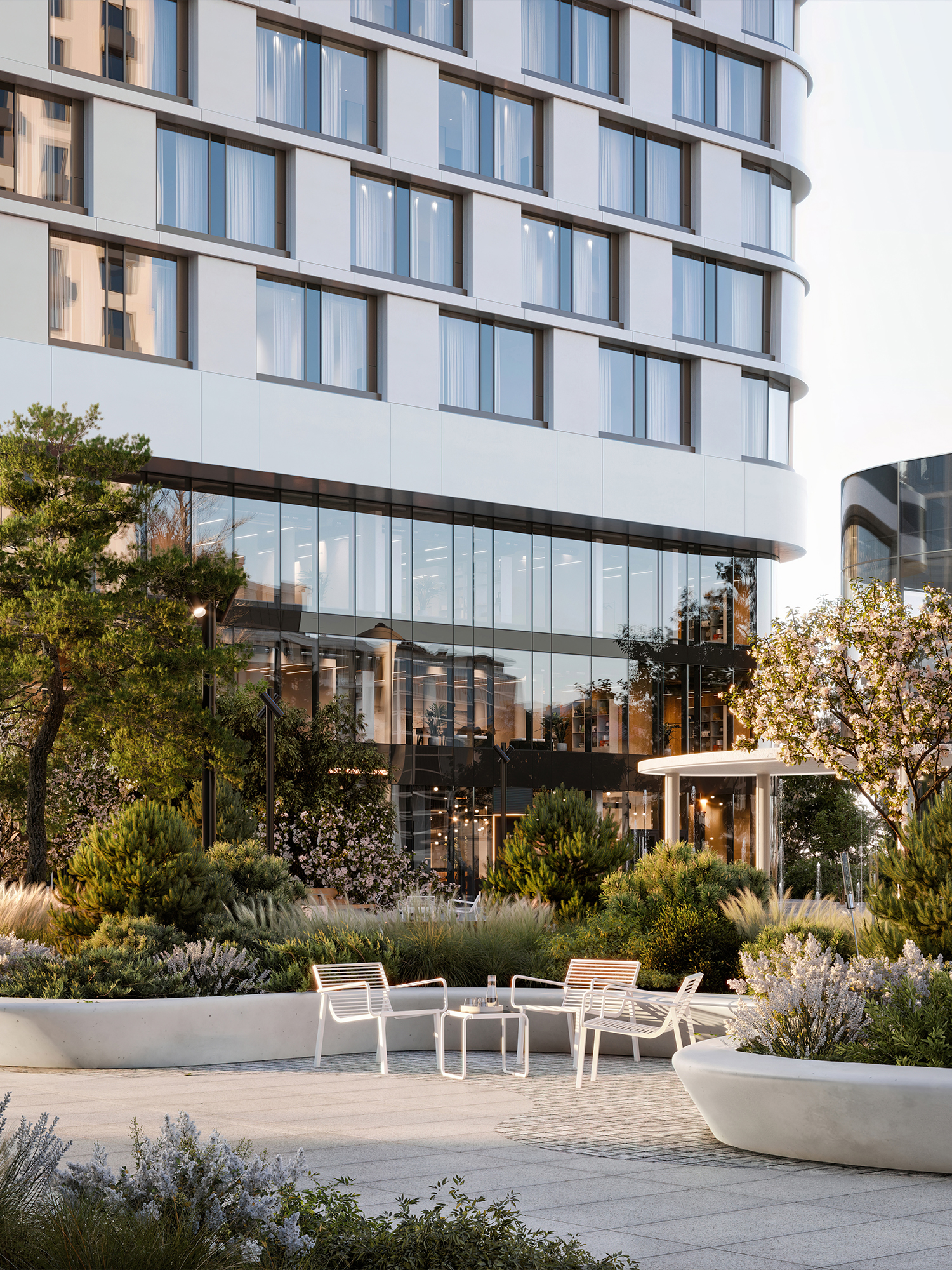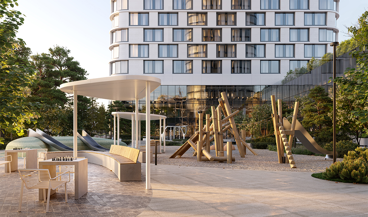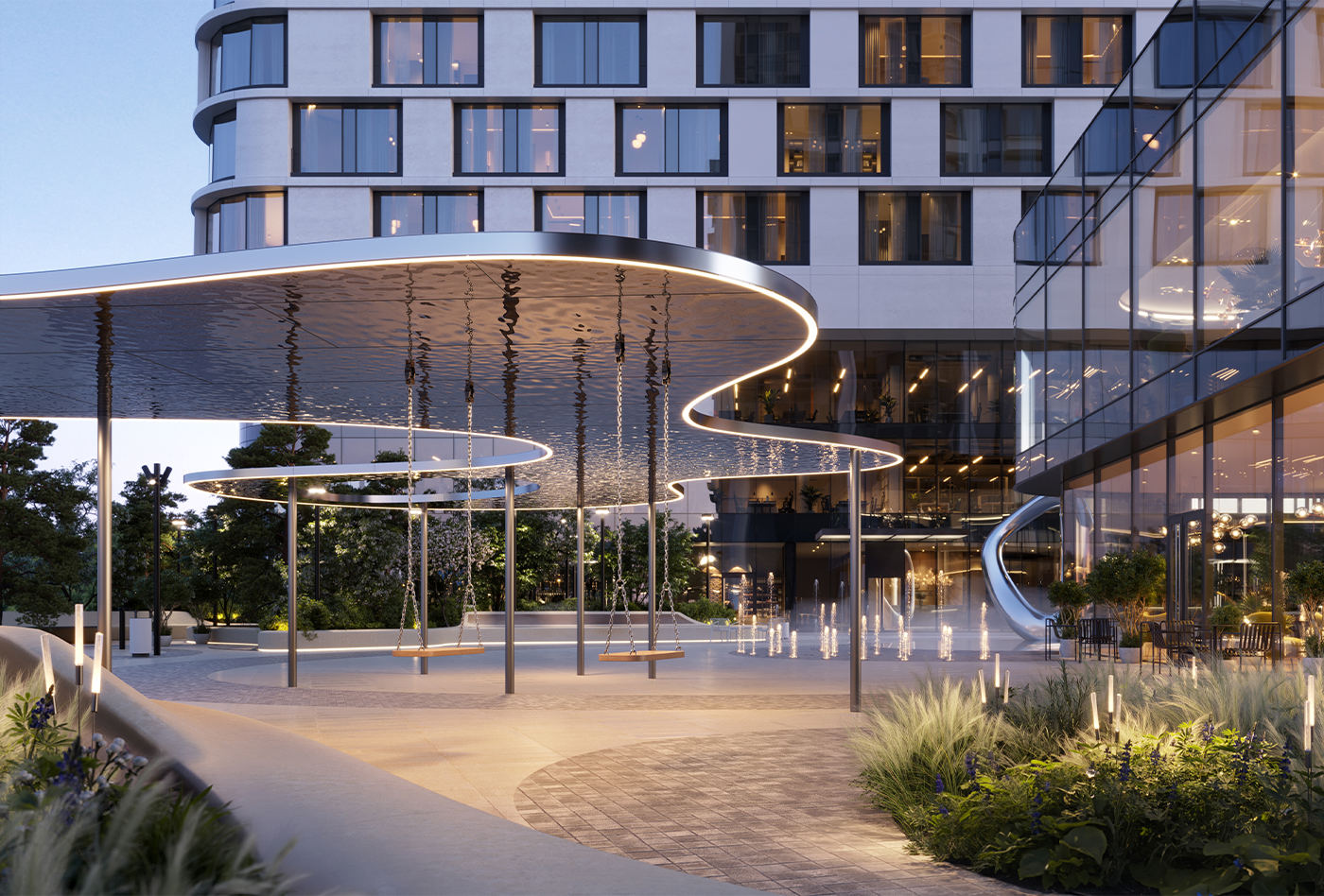 Связь с природой поддерживается ландшафтными решениеми от архитектурного бюро Scape: насыщенная зеленая территория дает возможность скрыться от шума города или качественно провести время с семьей или друзьями. Во внутреннем дворе расположена центральная площадь с зоной летнего кафе, фонтаном и арт-объектом, которая станет местом для соседских встреч и приятного совместного времяпрепровождения.