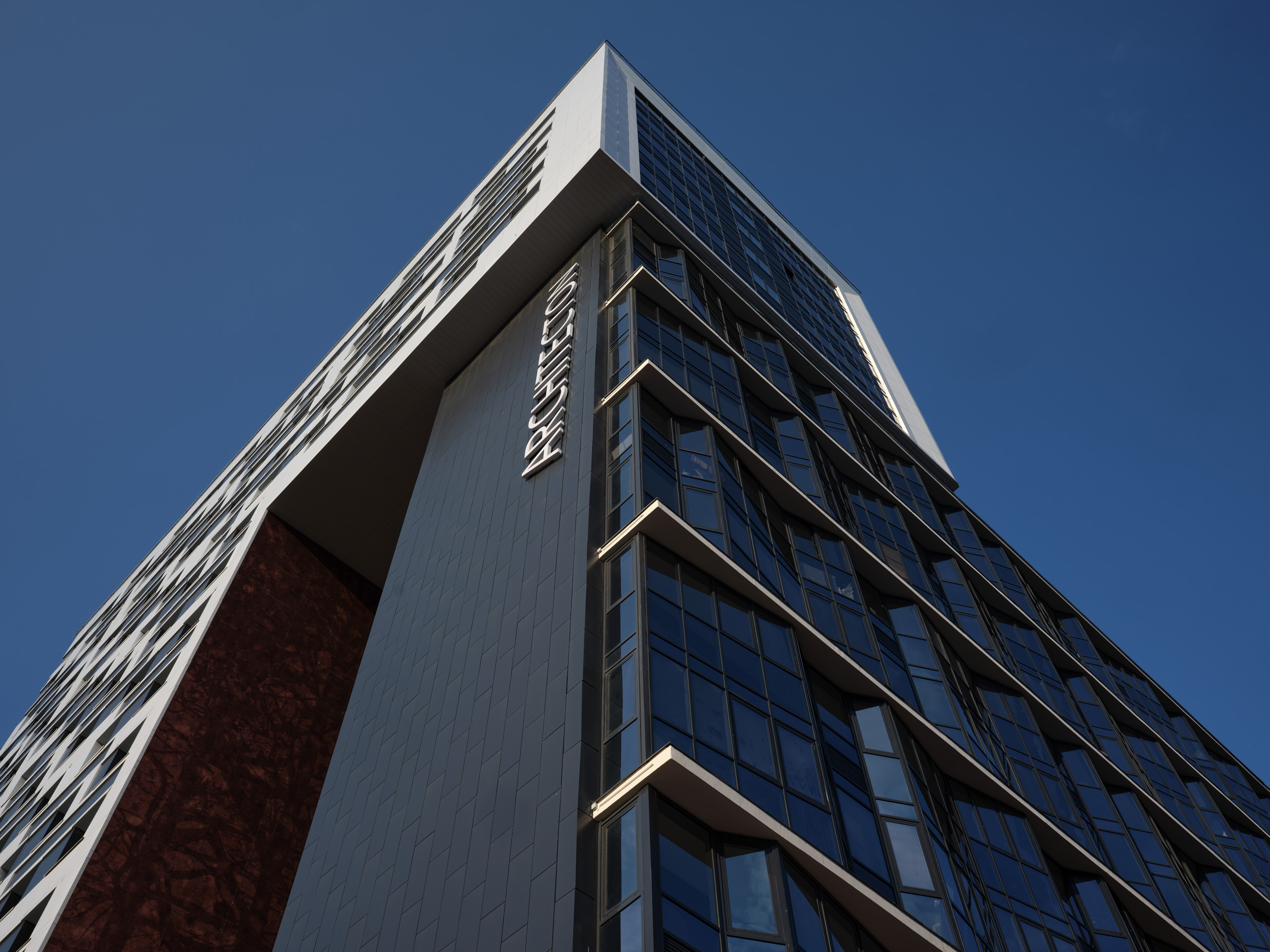 Экспериментальные модели зданий в 1920-х годах получили название «Архитектоны» и демонстрировали новые функциональные и конструктивные возможности. Именно эту метафору мы положили в основу архитектурного решения нашего проекта. Образ нового здания сформирован композицией крупных масс, где секции жилого дома, перпендикулярно пересекаясь, опираются друг на друга на высоте 12 этажей, формируя своеобразный гигантский портал, связывающий внешнее и внутреннее пространство комплекса. Так, создается особая драматургия напряженного взаимодействия двух объемов, один их которых решен линейно расчлененной матрицей фасада, а второй представляет сплошную ломаную стеклянную поверхность.